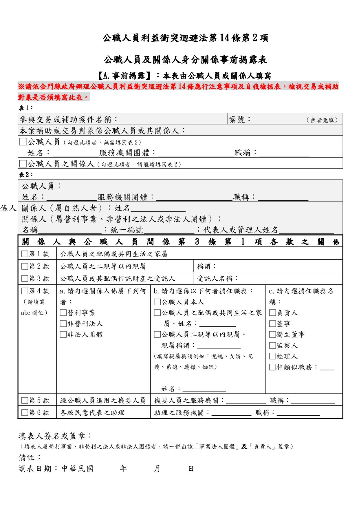 八、身分關係揭露說明:申請依法令規定以公開、公平方式辦理之補助時,申請時請填具「身分關係聲明書」,如申請補助者為《公職人員利益衝突迴避法》第2條、第3條所稱之公職人員或其關係人,且屬同法第14條第2項規定情形,於申請時應檢具「【A. 事前揭露】公職人員及關係人身分關係揭露表」,未依規定揭露者,將依同法第18條第3項規定,處新臺幣5萬元以上、50萬元以下罰鍰,並得按次處罰;本機關(單位)於補助行為成立後,應填具「【B. 事後公開】公職人員及關係人身分關係事後公開表」,並將身分關係公開於相關網站。