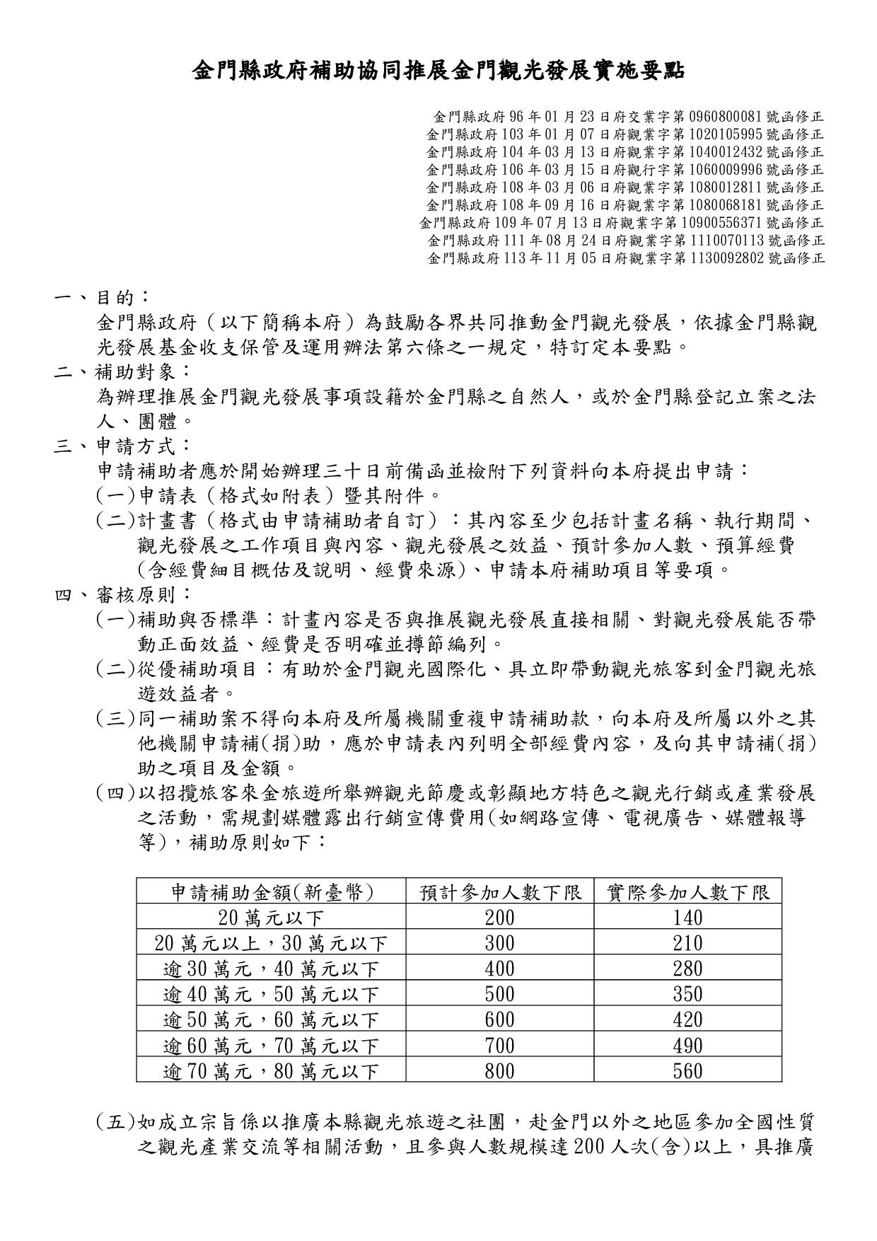依據:「金門縣政府補助協同推展金門觀光發展實施要點」(下稱補助要點)。