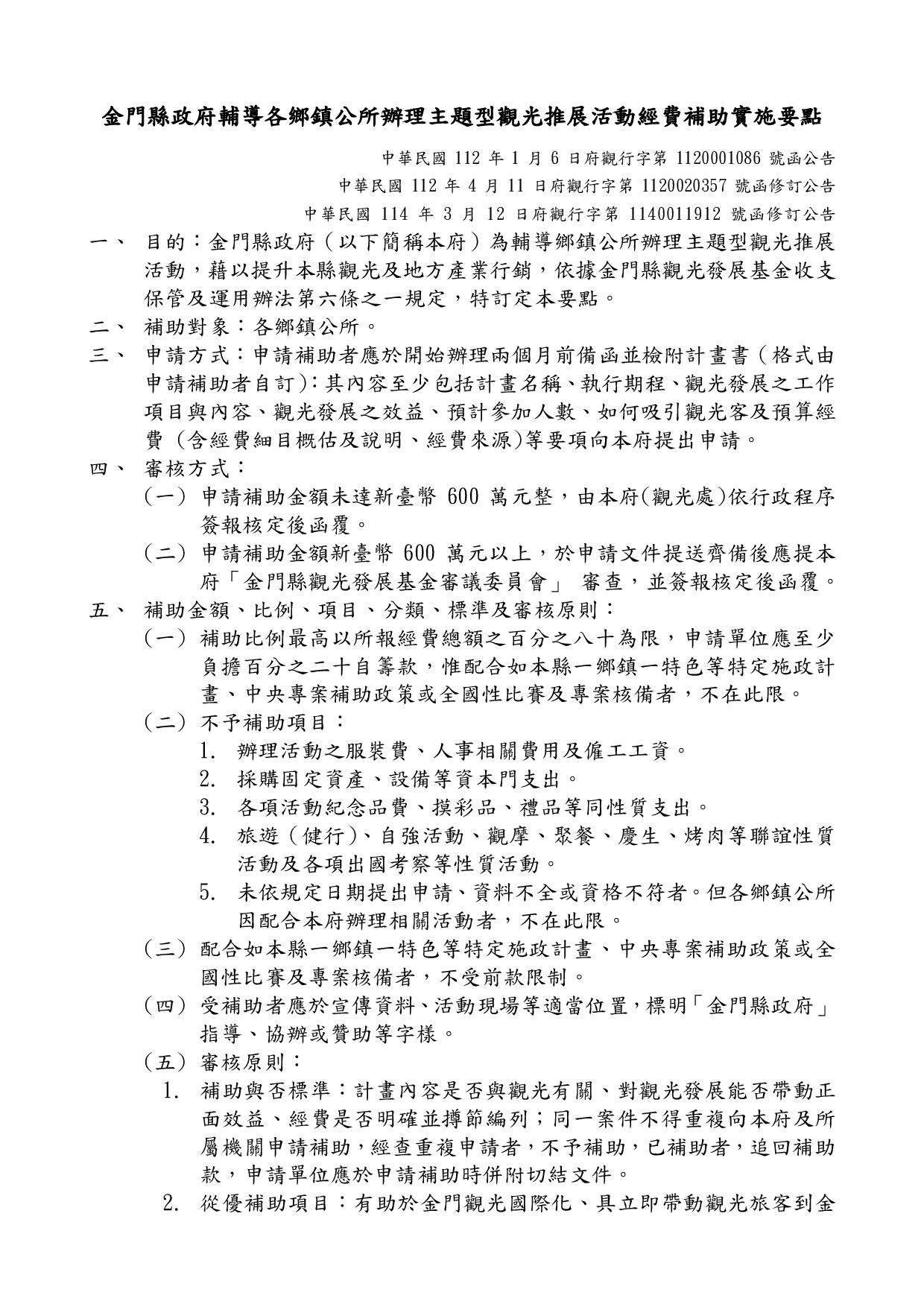 主旨: 公告本府 觀光處 為辦理「金門縣政府輔導各鄉鎮公所辦理主題型觀光推展活動經費補助實施要點」補助案件,請符合資格之金門縣鄉鎮公所,自114年1月1日起至114年12月31日止提出申請,並依照公告事項規定辦理。 依據: 本府 觀光處 「 金門縣政府輔導各鄉鎮公所辦理主題型觀光推展活動經費補助實施要點 」 (下稱 補助要點 )。 公告事項: 一、目的:金門縣政府(以下簡稱本府)為輔導鄉鎮公所辦理主題型觀光推展活動,藉以提升本縣觀光及地方產業行銷,依據金門縣觀光發展基金收支保管及運用辦法第六條之一規定,特訂定本要點。 二、補助對象:各鄉鎮公所。 三、申請方式:申請補助者應於開始辦理兩個月前備函並檢附計畫書(格式由申請補助者自訂):其內容至少包括計畫名稱、執行期程、觀光發展之工作項目與內容、觀光發展之效益、預計參加人數、如何吸引觀光客及預算經費 (含經費細目概估及說明、經費來源)等要項向本府提出申請。 四、審核方式: (一) 申請補助金額未達新臺幣600萬元整,由本府(觀光處)依行政程序簽報核定後函覆。 (二) 申請補助金額新臺幣600萬元以上,於申請文件提送齊備後應提本府「金門縣觀光發展基金審議委員會」 審查,並簽報核定後函覆。 五、補助金額、比例、項目、分類、標準及審核原則: (一) 補助比例最高以所報經費總額之百分之八十為限,申請單位應至少負擔百分之二十自籌款,惟配合如本縣一鄉鎮一特色等特定施政計畫、中央專案補助政策或全國性比賽及專案核備者,不在此限。 (二) 不予補助項目: 1. 辦理活動之服裝費、人事相關費用及僱工工資。 2. 採購固定資產、設備等資本門支出。 3. 各項活動紀念品費、摸彩品、禮品等同性質支出。 4. 旅遊(健行)、自強活動、觀摩、聚餐、慶生、烤肉等聯誼性質活動及各項出國考察等性質活動。 5. 未依規定日期提出申請、資料不全或資格不符者。但各鄉鎮公所因配合本府辦理相關活動者,不在此限。 (三) 配合如本縣一鄉鎮一特色等特定施政計畫、中央專案補助政策或全國性比賽及專案核備者,不受前款限制。 (四) 受補助者應於宣傳資料、活動現場等適當位置,標明「金門縣政府」指導、協辦或贊助等字樣。 (五) 審核原則: 1. 補助與否標準:計畫內容是否與觀光有關、對觀光發展能否帶動正面效益、經費是否明確並撙節編列;同一案件不得重複向本府及所屬機關申請補助,經查重複申請者,不予補助,已補助者,追回補助款,申請單位應於申請補助時併附切結文件。 2. 從優補助項目:有助於金門觀光國際化、具立即帶動觀光旅客到金門觀光旅遊效益者。 3. 申請單位若有同一案同時向其他政府機構申請補助者,請於計畫中敘明申請其他補助之名稱及金額,俾供審查參考。 六、 補助撥款程序: 1. 補助經費之撥付得參照「金門縣政府委託各機關、學校或洽請其代辦經費撥付及憑證保管等注意事項」辦理。 2. 受補助單位應於活動結束一個月內將成果報告(含照片)一式二份、總執行經費明細表(按計畫內所需項目辦理結算)、支出分攤表、領據等資料提送本府辦理結案核銷。 3. 補助經費納入各鄉鎮公所預算者,撥款時應檢附納入預算證明。 4. 如需事先申請撥款,應於核定補助款後函送領據到府辦理核撥,於事後覈實核銷。自籌款如未達實際執行計畫總經費20%者,須按比例繳回補助款。 七、 督導考核機制: (一) 為了解活動實際執行情形,本府得進行實地輔導、考核。必要時,得請受補助單位針對計畫執行情形、成果作報告。 (二) 凡無正當事宜由逾越補助經費核銷期限,本府將予以列管作為下次補助之考量。 八、本要點未規定事項,依其他相關法令規定辦理。 九、身分關係揭露說明:申請依法令規定以公開、公平方式辦理之補助時,申請時請填具「身分關係聲明書」,如申請補助者為《公職人員利益衝突迴避法》第2條、第3條所稱之公職人員或其關係人,且屬同法第14條第2項規定情形,於申請時應檢具「【A. 事前揭露】公職人員及關係人身分關係揭露表」,未依規定揭露者,將依同法第18條第3項規定,處新臺幣5萬元以上、50萬元以下罰鍰,並得按次處罰;本機關(單位)於補助行為成立後,應填具「【B. 事後公開】公職人員及關係人身分關係事後公開表」,並將身分關係公開於相關網站。 十、相關檔案(檢附相關檔案各1份): (一)補助依據(金門縣政府輔導各鄉鎮公所辦理主題型觀光推展活動經費補助實施要點) (二)身分關係聲明書 (三)【 A. 事前揭露】公職人員及關係人身分關係揭露表