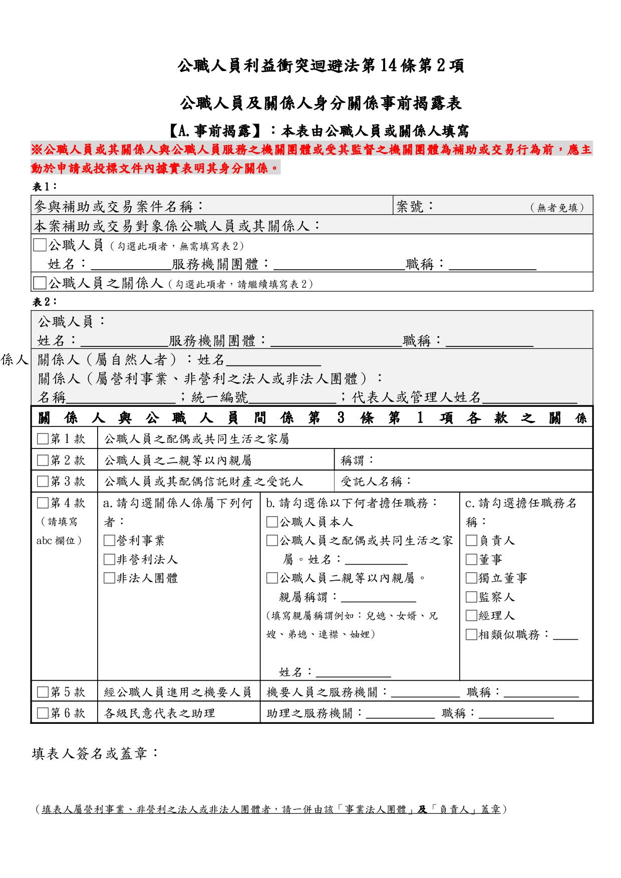 七、身分關係揭露說明:如申請補助者為公職人員利益衝突迴避法第2條、第3條所稱之公職人員或其關係人,於申請時應檢具「【A.事前揭露】公職人員及關係人身分關係揭露表」,未揭露者將依公職人員利益衝突迴避法第18條第3項規定處新臺幣5萬元以上50萬元以下罰鍰,並得按次處罰;本機關(單位)於補助行為成立後,應填寫「【B.事後公開】公職人員及關係人身分關係事後公開表」,並將身分關係公開於相關網站。